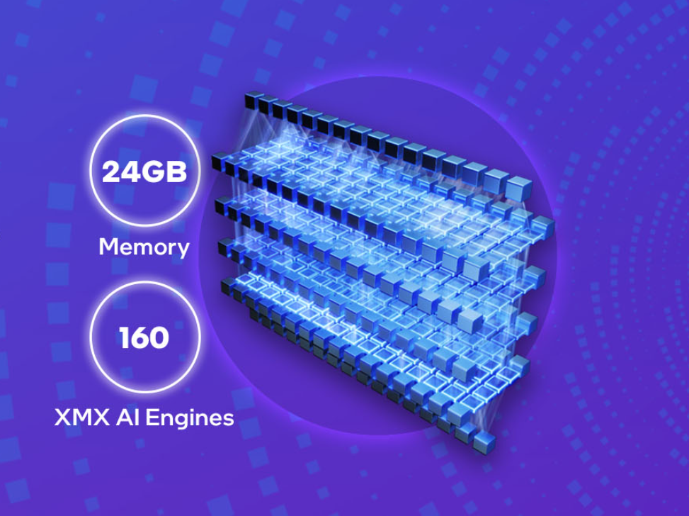 Wyposażenie karty w 24 GB dedykowanej pamięci GDDR6 o przepustowości do 456 GB/s otwiera zupełnie nowe możliwości w zakresie lokalnego przetwarzania sztucznej inteligencji. Tak duża pojemność pozwala na uruchamianie modeli AI o znacznie większej liczbie parametrów przy zachowaniu wysokiej precyzji i dokładności wyników bez opóźnień przesyłu danych. Twórcy treści cyfrowych mogą dzięki temu pracować nad projektami o ogromnej szczegółowości i złożoności, które wcześniej wymagały znacznie droższych rozwiązań serwerowych. Dodatkowo 160 jednostek Intel XMX AI znacząco przyspiesza operacje macierzowe, co bezpośrednio przekłada się na krótszy czas generowania efektów pracy.