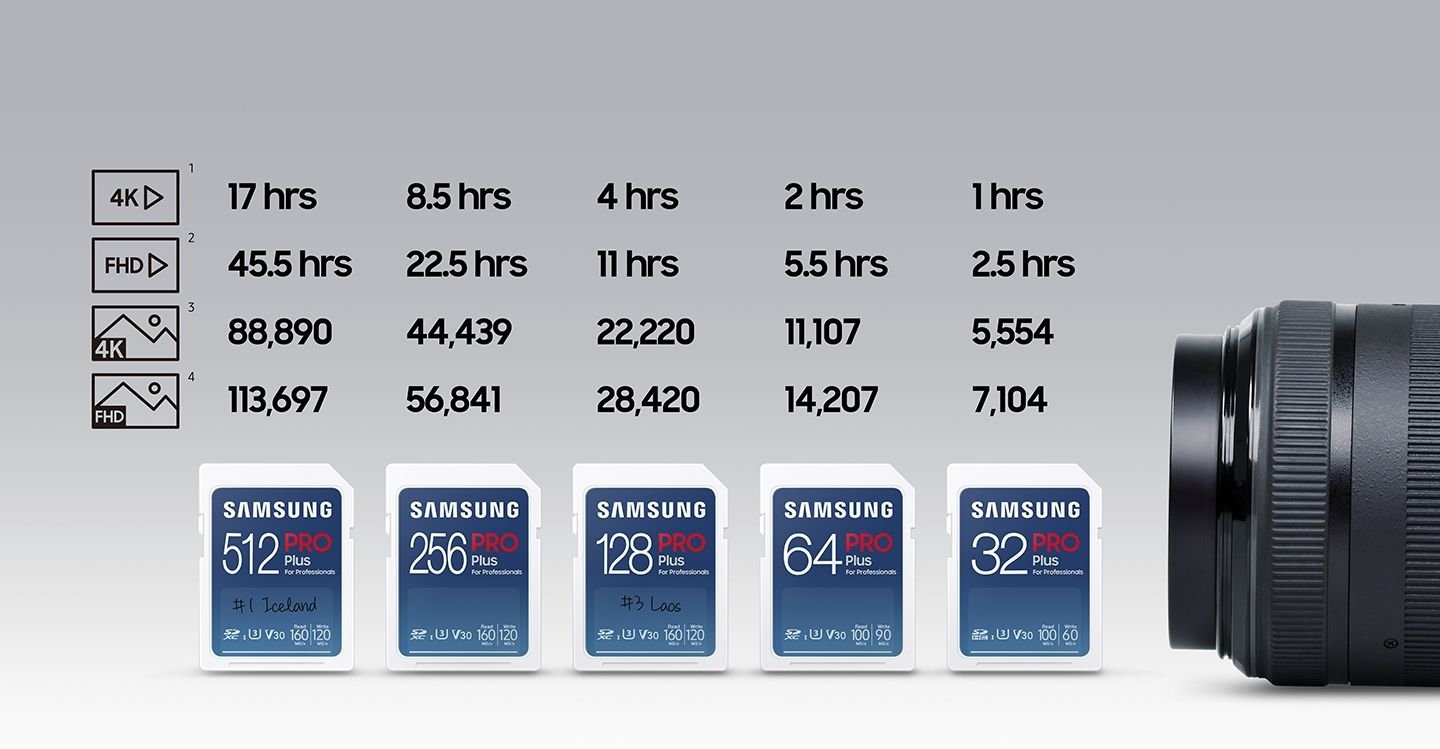 Do dyspozycji otrzymujesz pojemności: 512 GB, 256 GB, 128 GB, 64 GB lub 32 GB. Taki wybór pozwoli Ci dobrać najlepsze rozwiązanie do Twoich preferencji i stylu pracy. Nigdy już nie martw się, że zabraknie Ci miejsca. Karta pamięci Samsung PRO Plus o pojemności wynoszącej 256 GB pomieści 8.5 godziny wideo 4K UHD, 22.5 godziny wideo Full HD lub 44,439 zdjęć. Od teraz możesz cieszyć się tym, co oferuje życie. I wszystko to zachowaj na pamiątkę.