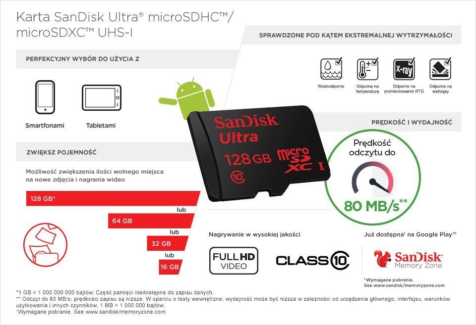 Adapter dołączony do zestawu znacząco poszerza możliwości zastosowania. Dzięki jednemu zakupowi możemy pozyskać jednocześnie kartę w formacie MicroSD oraz klasycznej SD. Co więcej, dzięki niemu transfery plików między urządzeniami będą jeszcze wygodniejsze. Wiele adapterów dołączonych do zestawu posiada specjalny przełącznik pozwalający zablokować zapis na karcie.