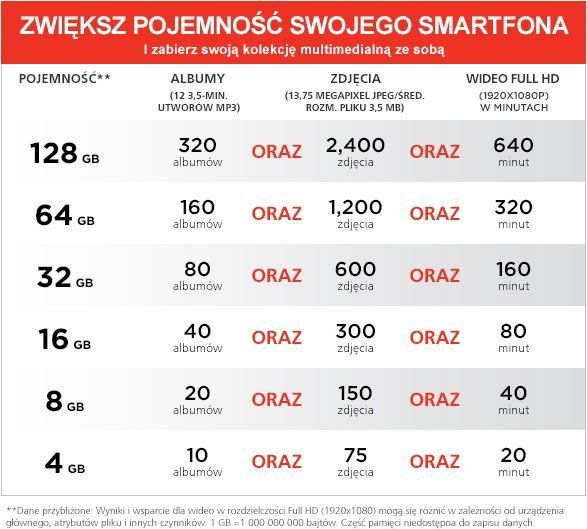 1Zdjęcie = 3MB 2mp3 = 3,5MB 31h filmu FullHD = 4GB