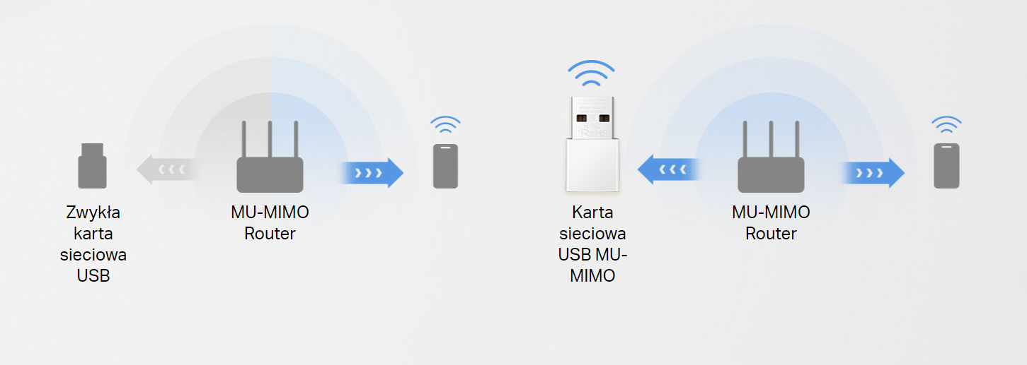 Technologia MU-MIMO zapewnia dwa jednoczesne strumienie danych, poprawiając przepustowość i wydajność całej sieci podczas współpracy z kompatybilnym routerem MU-MIMO.