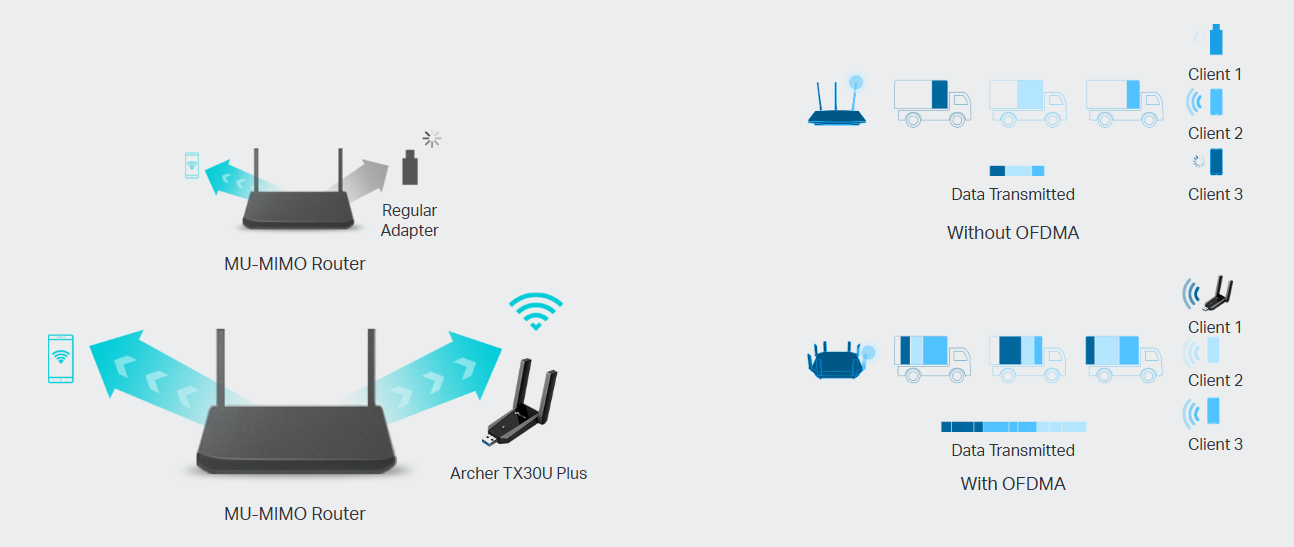 TX30U Plus wykorzystuje technologie MU-MIMO i OFDMA do poprawy jakości połączenia internetowego w zatłoczonych domach i biurach. Skutkuje to redukcją opóźnień (latency), zwiększoną wydajnością i minimalizacją przeciążenia sieci. Zwiększa to przepustowość i efektywność całej sieci, umożliwiając jednoczesne przesyłanie wielu strumieni danych. Ciesz się płynną łącznością, optymalizowaną przepustowością i niższymi opóźnieniami dla lepszej pracy wielu urządzeń jednocześnie.