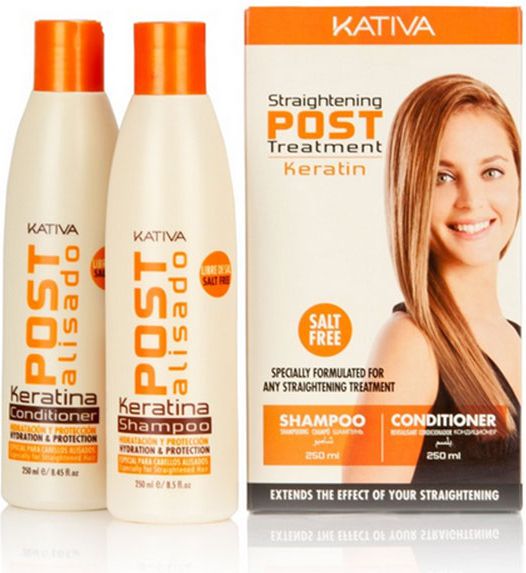 Kativa Zestaw POST z karatyną dla włosów po zabiegu trwałego wygładzania. Pielęgnuje i chroni włosy po zabiegu. Zawiera keratynę. Przeznaczony jest do pielęgnacji włosów zniszczonych, suchych oraz po zabiegu trwałego wygładzania włosów.