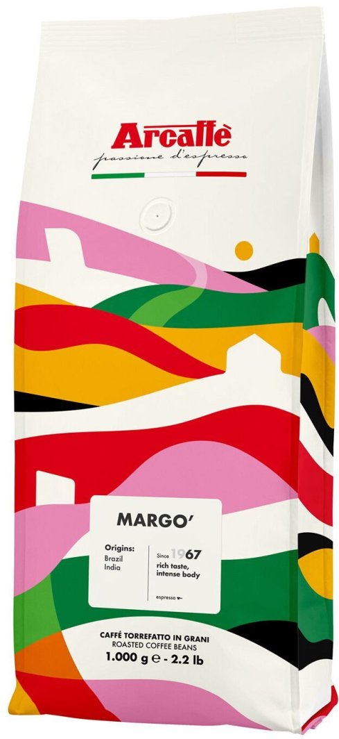 Mieszanki Arcaff stanowią syntezę najlepszych kaw plantacyjnych na świecie, prażonych osobno i mieszanych, aby zapewnić konsumentom wyjątkowe doznania smakowe. Każda mieszanka ma swoją niepowtarzalną tożsamość, a wszystkie zawierają wyłącznie kawę z certyfikatem CSC. Arcaffe Margo to mocna kawa, idealna na pobudzające espresso, sprawdza się bardzo dobrze do kaw mlecznych jak cappuccino lub latte. Mieszanka ziaren 50/50 Arabica i Robusta pozwala stworzyć kawę o wyrazistym aromacie z wyczuwalną nutą czekolady. Duża zawartość kofeiny doskonale zadziała nawet na najbardziej opornych kawoszy.
