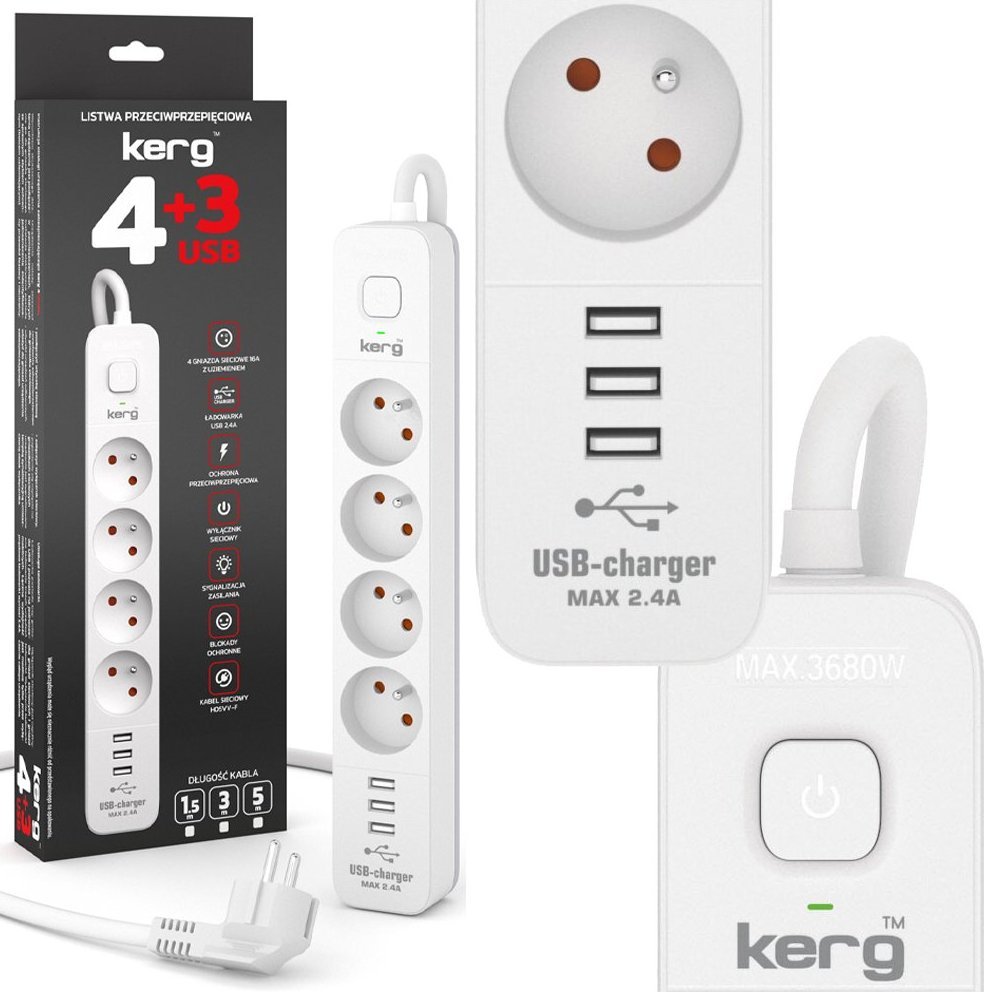 Kerg Przedłużacz z wyłącznikiem, 4 gniazda, 3 USB, 3m (M02414)