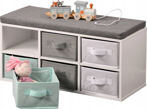 Ławka została wzbogacona o miękką poduszkę, co zapewnia dzieciom wygodę podczas odpoczynku, czytania książek czy zakładania butów. To idealne miejsce, gdzie maluchy mogą spędzać czas w komfortowych warunkach.