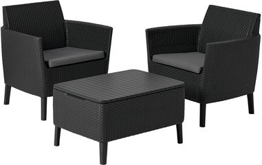 Nowoczesny, opływowy kształt, wygoda i wysoka jakość wykonania to główne atuty balkonowego zestawu Salemo. W skład kompletu wchodzą dwa obszerne fotele oraz stolik z funkcją schowka. Faktura powierzchni imitująca rattanowy splot podwyższa walory estetyczne produktu. Meble są łatwe w utrzymaniu w czystości, proste w montażu i odporne na działanie niekorzystnych warunków pogodowych.