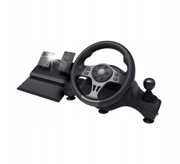 W zestawie znajduje się podstawa z pedałami, co pozwala na pełne wykorzystanie możliwości kierownicy. Dzięki pedałom możesz precyzyjnie kontrolować przyspieszenie i hamowanie, co jest kluczowe w grach wyścigowych.