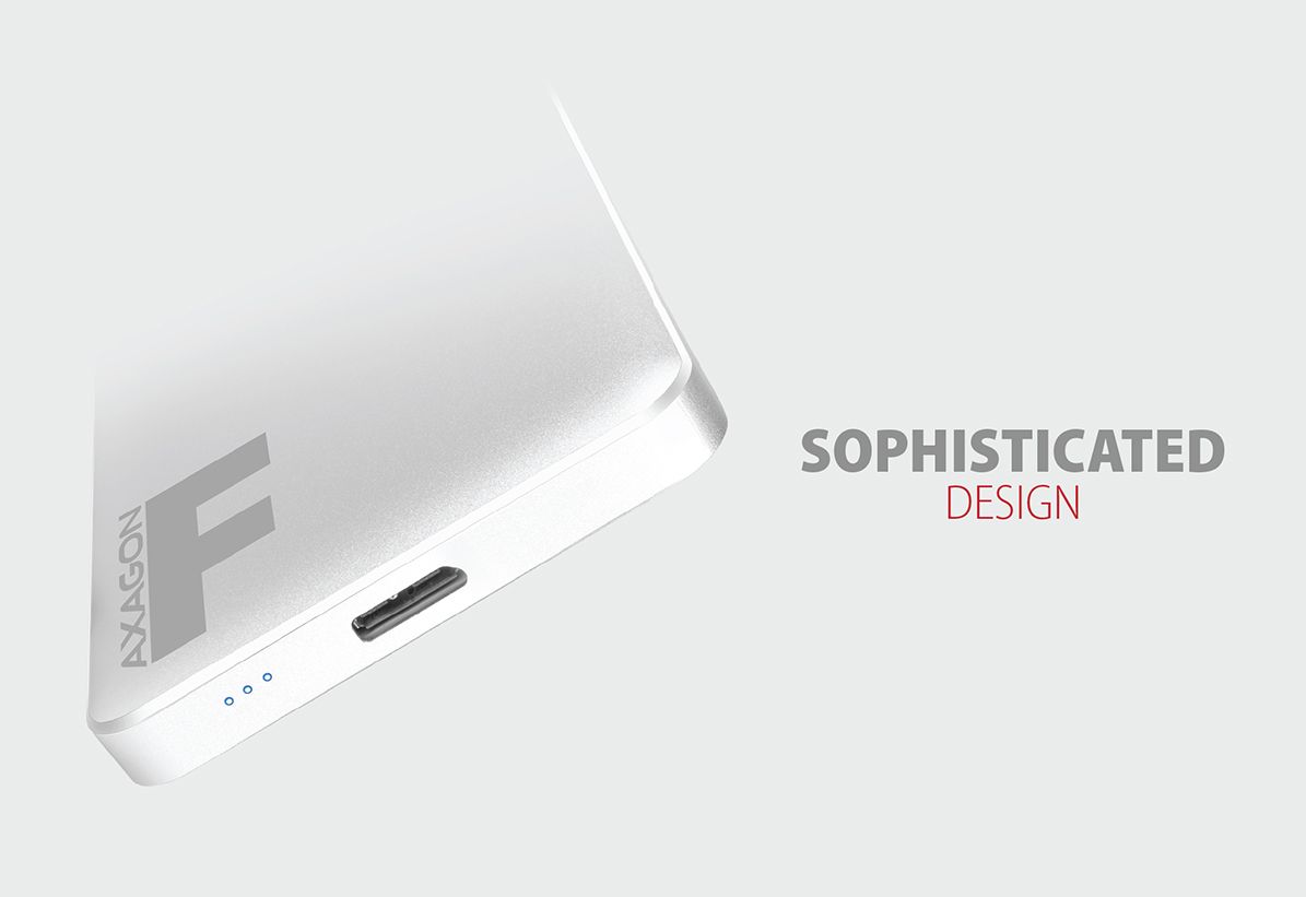 Lekka a równocześnie wytrzymała obudowa cało-aluminiowa dla doskonałej ochrony mechanicznej dysku oraz doskonałego odprowadzania ciepła. Elegancka matowa powierzchnia skutecznie uniemożliwia powstanie niepożądanych śladów palców. Kompaktowe wymiary i zaokrąglenie wszystkich naroży sprawi radość każdemu użytkownikowi mobilnemu. W sposób dyskretny wykonane niebieskie światło wskazywania LED.