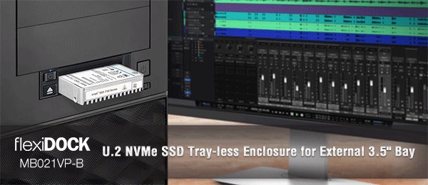 FlexiDOCK MB021VP-B to kompaktowa stacja dokująca U.2 NVMe PCIe 3.0/4.0 SSD. Dzięki zastosowaniu złącza SFF-8654 osiąga ona prędkość przesyłu danych do 64 Gbps. MB021VP-B montowana jest w pojedynczą zewnętrzną zatokę 3,5" (np zamiast stacji dyskietek) i umożliwia dokowanie dysków bez konieczności stosowania narzędzi czy zewnętrznych tacek. Takie rozwiązanie oznacza możliwość zmiany nośnika bez konieczności wyłączania komputera czy otwierania jego obudowy.