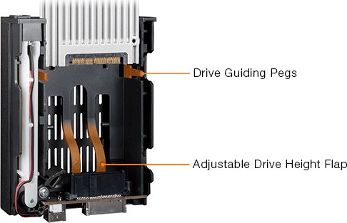 Zastosowanie specjalnych wypustek prowadzących ułatwia poprawny i bezpieczny montaż dysku w zatoce niezależnie od ich grubości. Prowadnice boczne naprowadzają dysk na złącze danych, a ruchome klapki kompensują różnice w rozmiarze dysku 7mm i 15mm.