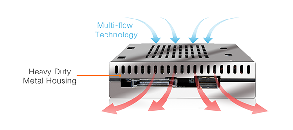 Wytrzymała, metalowa konstrukcja chroni dysk przed negatywnym wpływem środowiska zewnętrznego. Przemyślane rozmieszczenie otworów wentylacyjnych umożliwia pasywne odprowadzanie nadmiaru energii cieplnej z pracującego dysku zapewniając tym samym bezpieczną temperaturę pracy.
