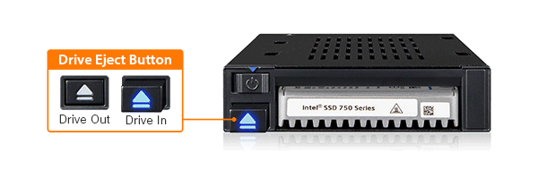 Otwarta konstrukcja MB021VP-B umożliwia błyskawiczną podmianę nośników U.2 NVMe SSD. Po zainstalowaniu dysku w zatoce zewnętrzny przycisk wysuwa się, a znajdująca się na nim kontrolka LED zapala się informując o jego gotowości do użycia.