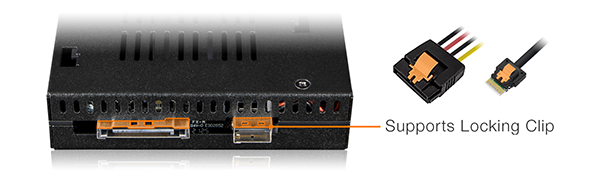 Zarówno złącze danych jak i zasilania wspierają zatrzaski zabezpieczające przed przypadkowym odpięciem.