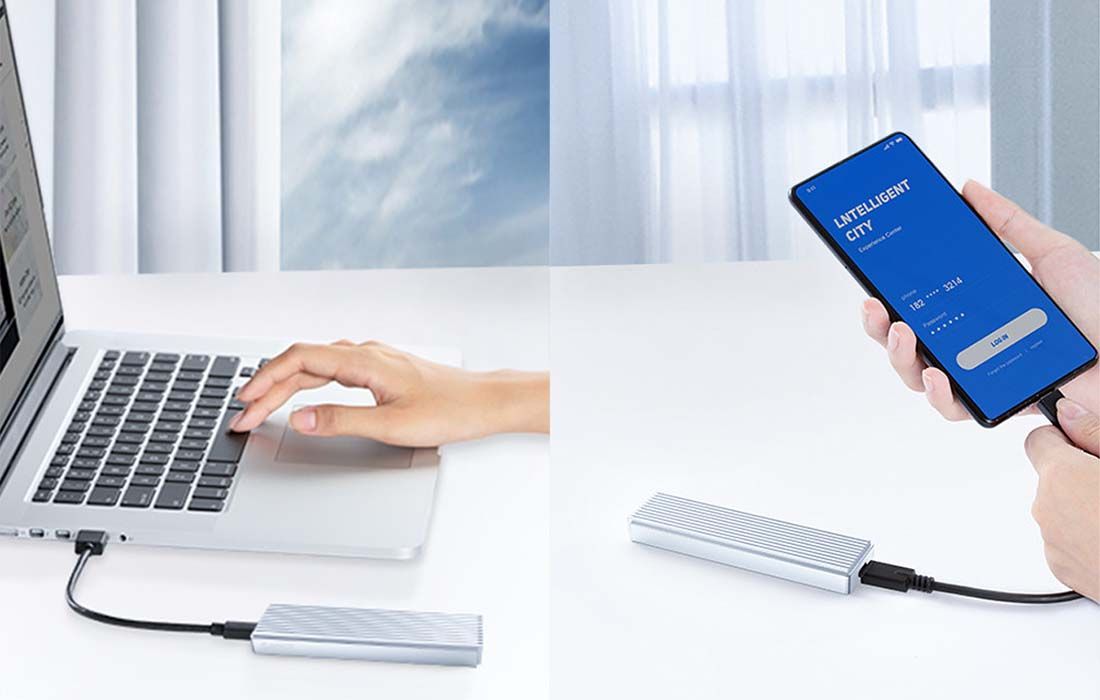 Obudowa Orico M2PJ-C3-GY-BP doskonale współpracuje zarówno z laptopami, jak i smartfonami. Z powodzeniem podłączysz do niej wybrane urządzenia za pomocą kabla USB-A do USB-C lub USB-C do USB-C. Teraz szybko i wygodnie przeniesiesz pliki między dyskiem SSD a telefonem!