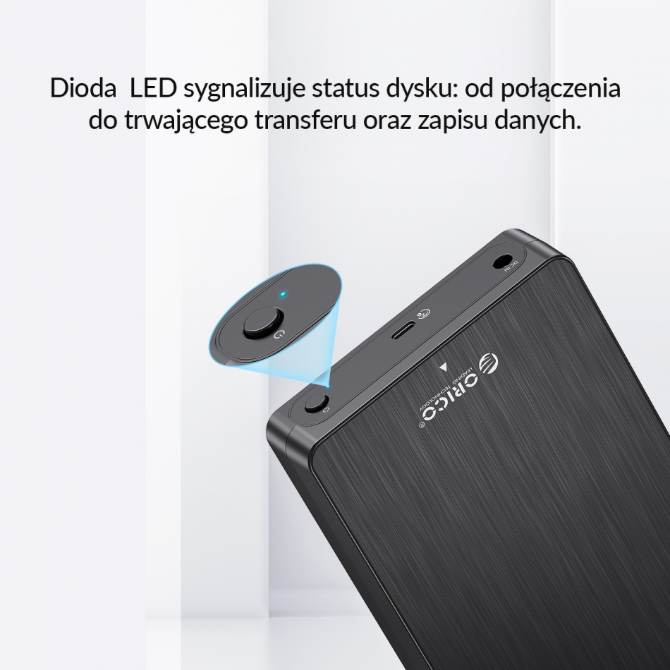 Dioda LED poinformuje o statusie dysku - zapala się, kiedy trwa transfer oraz zapisywanie, a gaśnie, przechodząc do stanu uśpienia po 10 minutach.