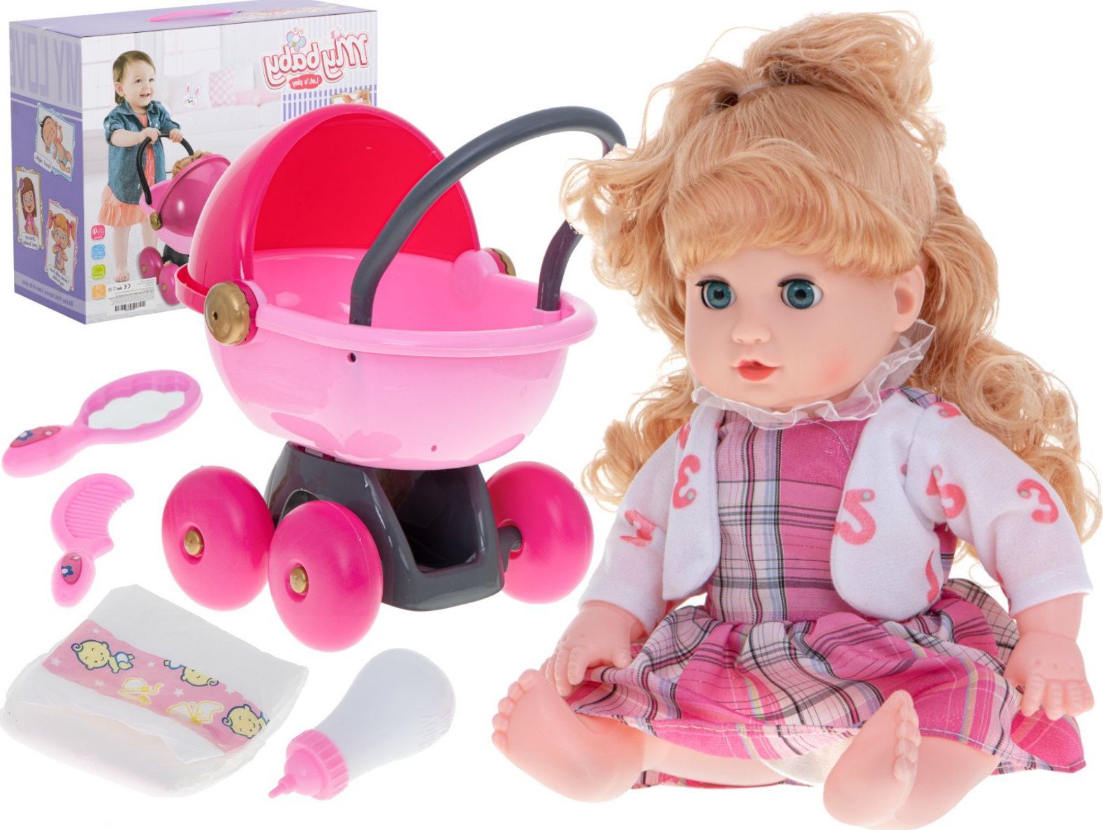 KIK Lalka Ala z wózkiem+akcesoria sukienka w kratkę