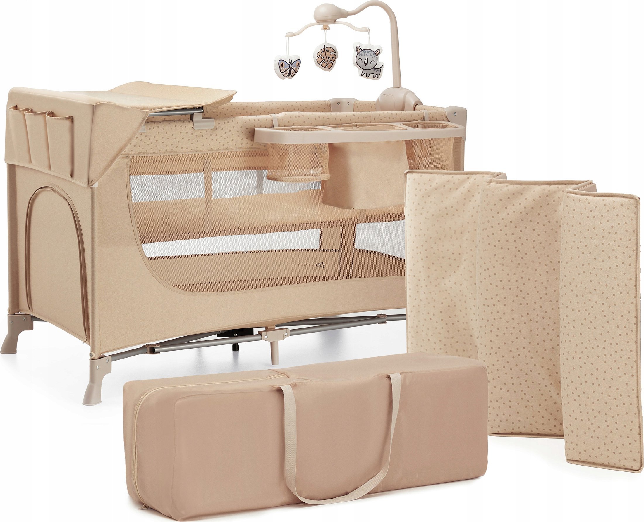- Zawartość zestawu: Łóżeczko, podwieszana podłoga, przewijak, organizer na akcesoria, interaktywna karuzela, torba transportowa, instrukcja obsługi