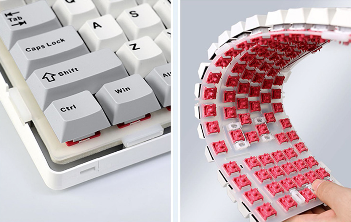 Żywa wyrazista kolorystyka, wyrafinowane czucie, tłumienie akustyczne pianką PORON, wiele opcji przełączników, szczelinowa konstruckaj PCB, elastyczny klik, pięciowarstwowe wypełnienie wyciszające!