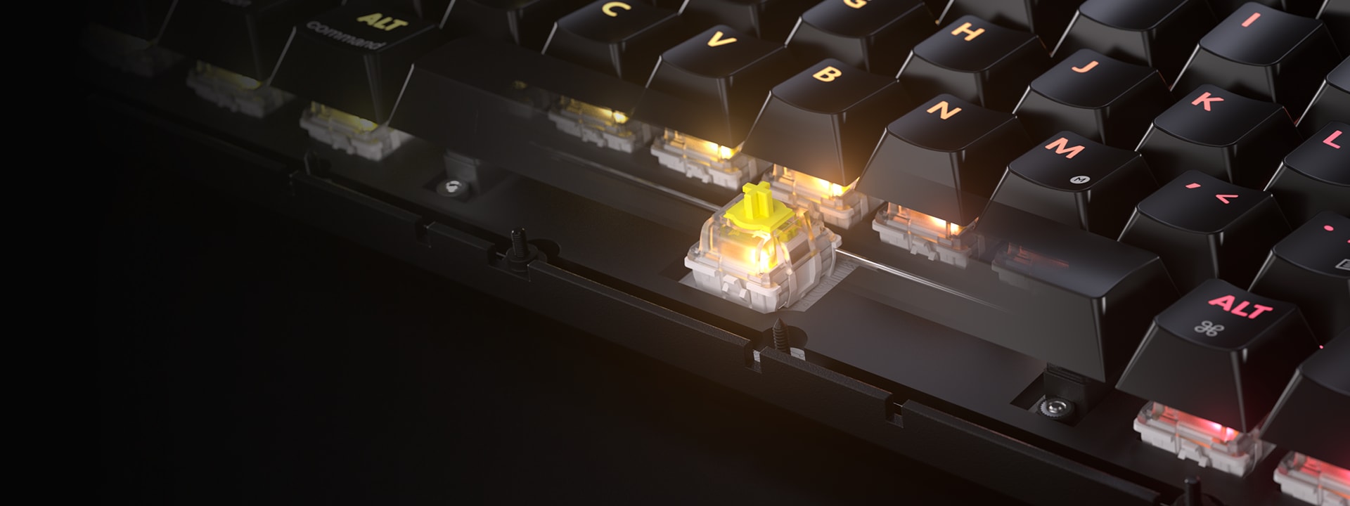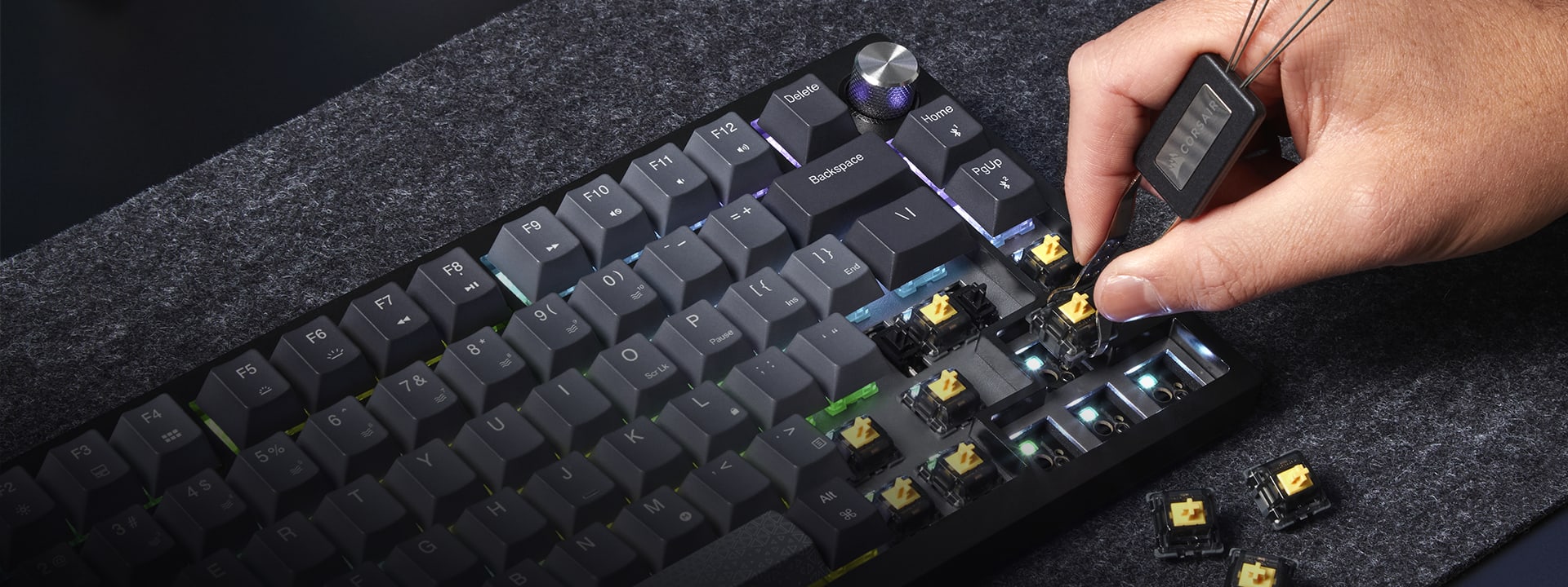 Pod każdym klawiszem kryją się liniowe przełączniki mechaniczne Corsair MLX Fusion. Są one fabrycznie smarowane, co przekłada się na niezwykle gładki, płynny ruch i niemal natychmiastową rejestrację kliknięcia. Dzięki wysokiej kulturze pracy i stabilności, przełączniki te oferują doskonały balans między czułością wymaganą w e-sporcie a komfortem potrzebnym podczas pisania długich tekstów.