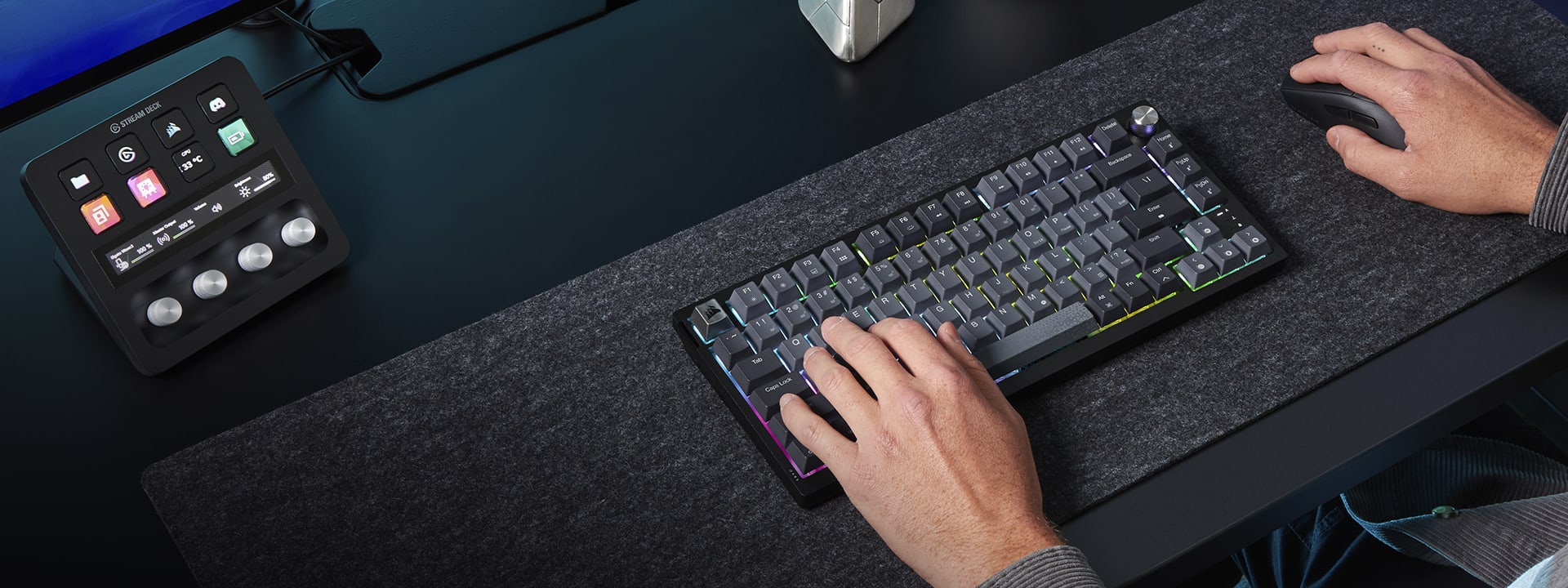 Zintegrowane w rogu metalowe pokrętło obrotowe zapewnia błyskawiczną kontrolę nad multimediami i funkcjami systemowymi. Domyślnie pozwala na regulację głośności, ale za pomocą oprogramowania CORSAIR iCUE możesz przypisać mu inne zadania, takie jak przewijanie stron, zoomowanie czy regulację jasności podświetlenia RGB. iCUE pozwala również na tworzenie zaawansowanych makr oraz synchronizację oświetlenia z resztą podzespołów Corsair.