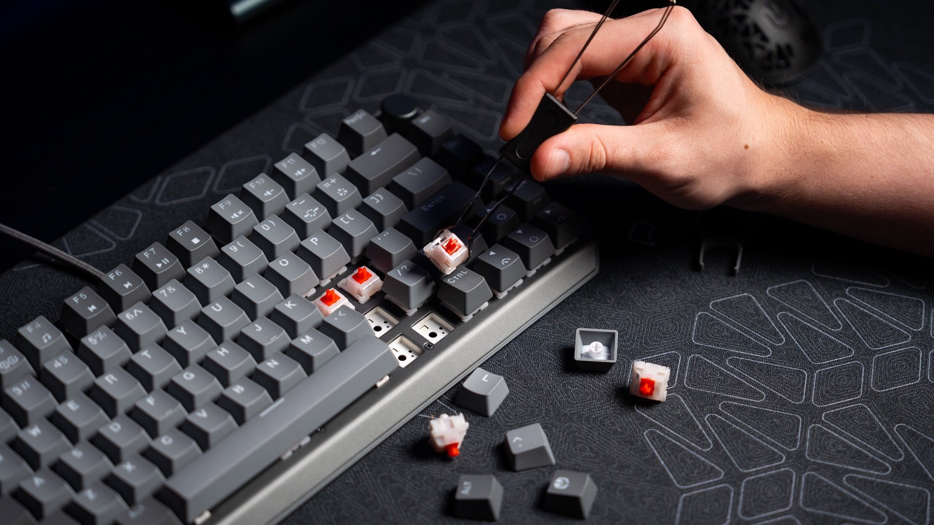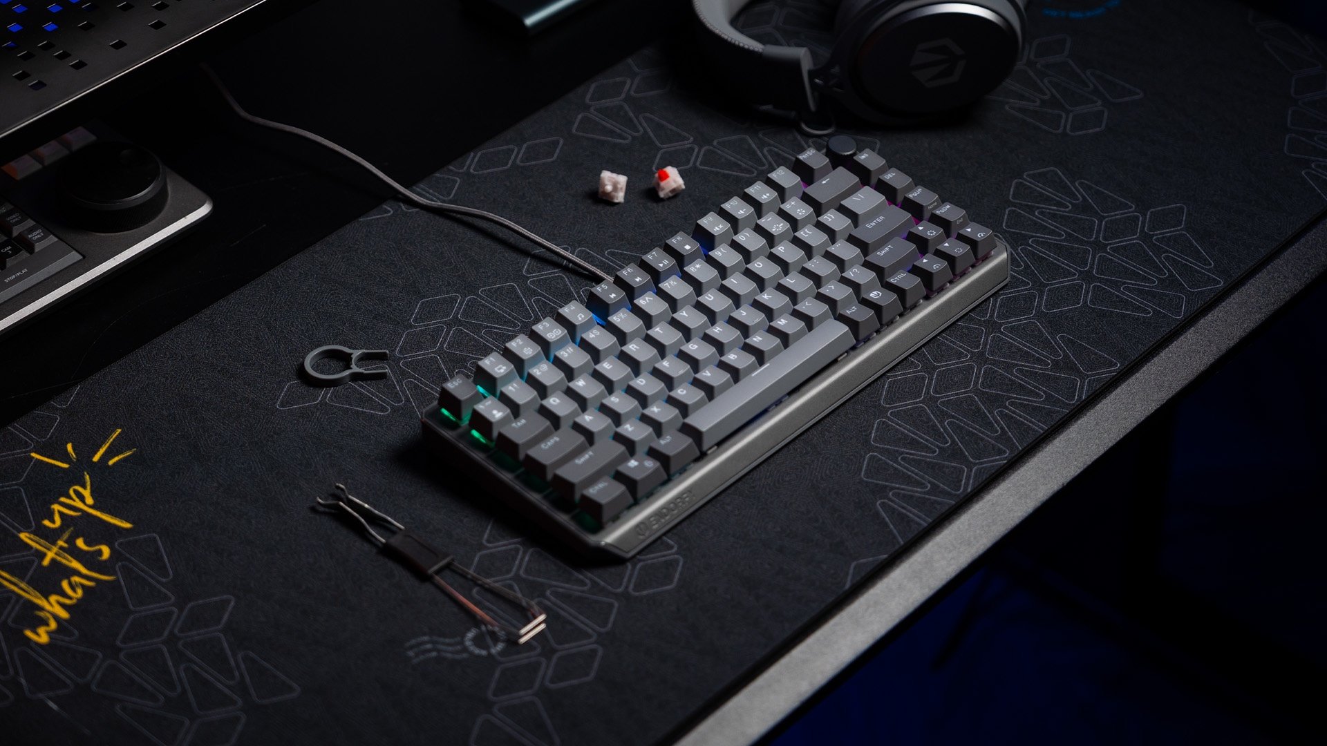 Thock V2 75% został wyposażony w komplet funkcjonalnych dodatków. W pudełku, oprócz urządzenia i przewodu USB, znajdziesz także narzędzia do wyjmowania keycapów oraz hotswappowania switchy. Na wszelki wypadek dorzuciliśmy też dwa zapasowe przełączniki ENDORFY Red.