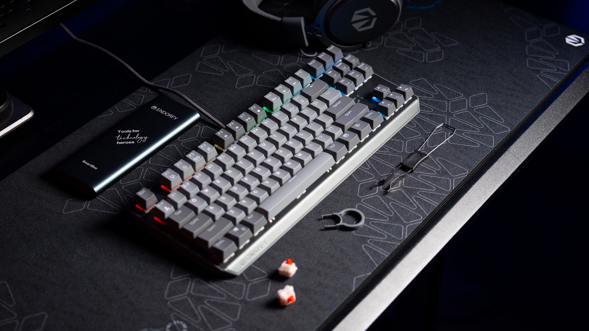 Thock V2 TKL został wyposażony w komplet funkcjonalnych dodatków. W pudełku, oprócz urządzenia i przewodu USB, znajdziesz także narzędzia do wyjmowania keycapów oraz hotswappowania switchy. Na wszelki wypadek dorzuciliśmy też dwa zapasowe przełączniki ENDORFY Red.