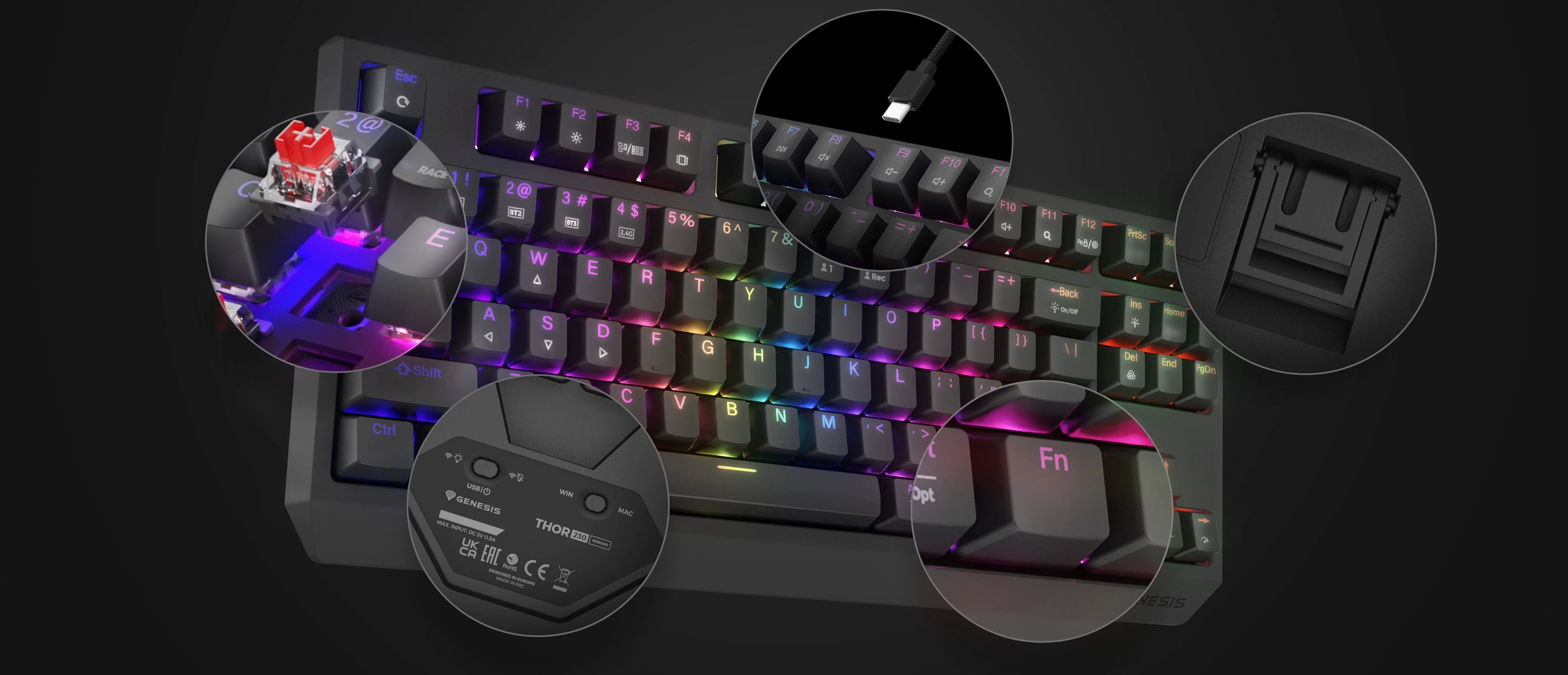 Przypadek? W GENESIS Thor 230 TKL Wireless nic nie jest przypadkowe. Oprócz wyżej wspomnianych udogodnień model ten zaoferuje Ci szereg rozwiązań, które sprawią, że rozgrywka stanie się jeszcze przyjemniejsza. Dedykowany kanał na ułożenie przewodu poprowadzonego w oplocie w dowolnym z 3 kierunków, podwójne, rozkładane nóżki ułatwiające regulację nachylenia w 2 poziomach, funkcja umożliwiająca aktywację klawiszy funkcyjnych bez konieczności używania “FN” – a to tylko niewielka część.