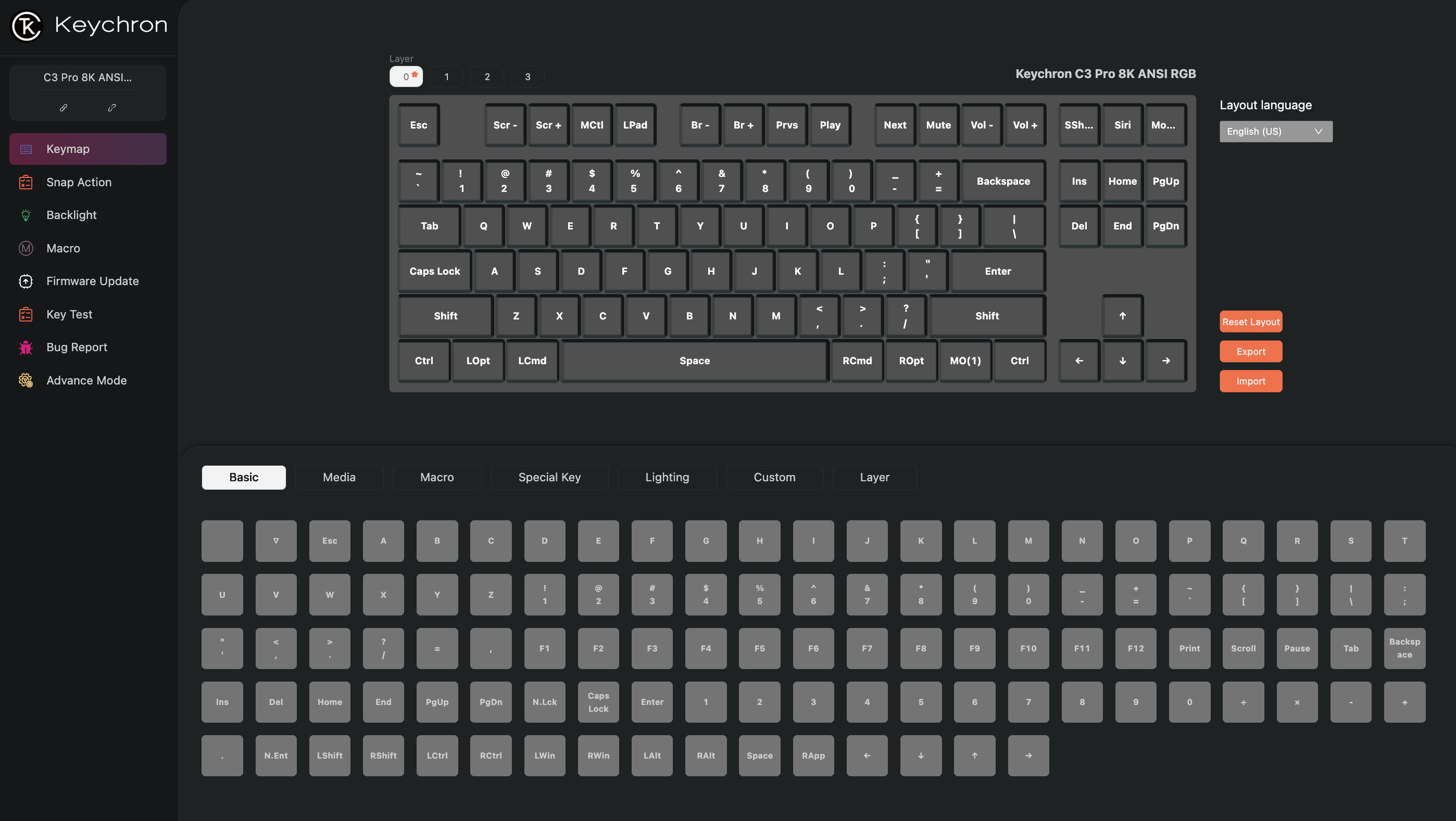 Model C3 Pro 8K obsługuje firmware QMK oraz konfigurację przez aplikację webową Keychron Launcher, umożliwiając tworzenie makr i zmianę przypisań klawiszy bez instalowania dodatkowego oprogramowania. Podświetlenie RGB (Red Green Blue) z północnym umiejscowieniem diod LED (Light Emitting Diode) poprawia czytelność oznaczeń klawiszy w słabym oświetleniu. Klawiatura jest kompatybilna z systemami macOS (Macintosh Operating System), Windows oraz Linux.