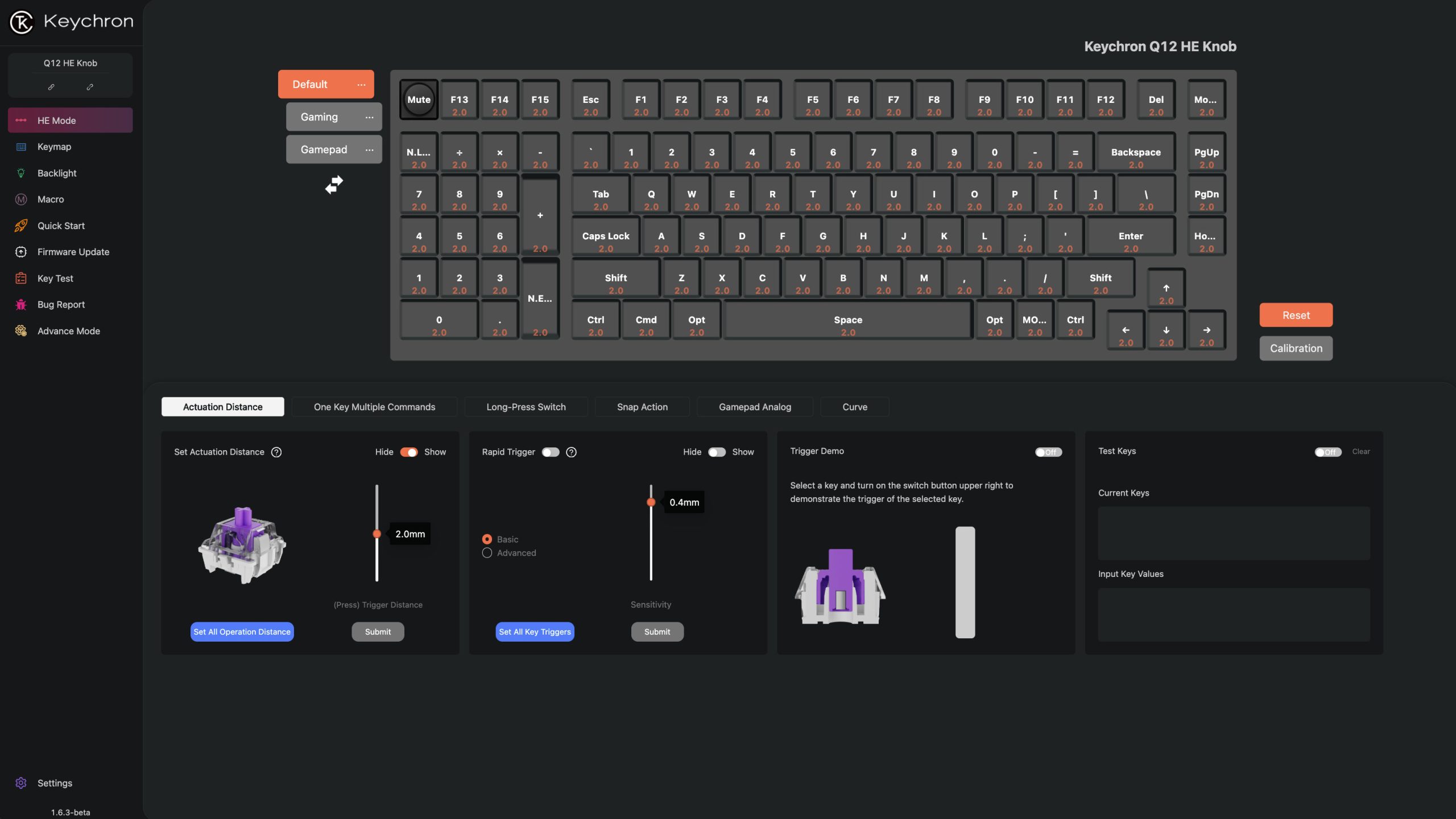 Keychron Q12 HE oferuje rozbudowane funkcje sterowania klawiszami, które zwiększają precyzję i kontrolę nad rozgrywką. Dynamic Rapid Trigger reaguje na rzeczywisty ruch klawisza, co przyspiesza aktywację i reset bez oczekiwania na stały punkt styku switcha. Multiple Actions pozwala przypisać do czterech różnych działań do jednego klawisza w zależności od głębokości naciśnięcia. Tryb Analog Mode umożliwia płynne sterowanie, zbliżone do kontrolera, co znacznie rozszerza możliwości kontroli szczególnie w grach symulacyjnych i wyścigowych.