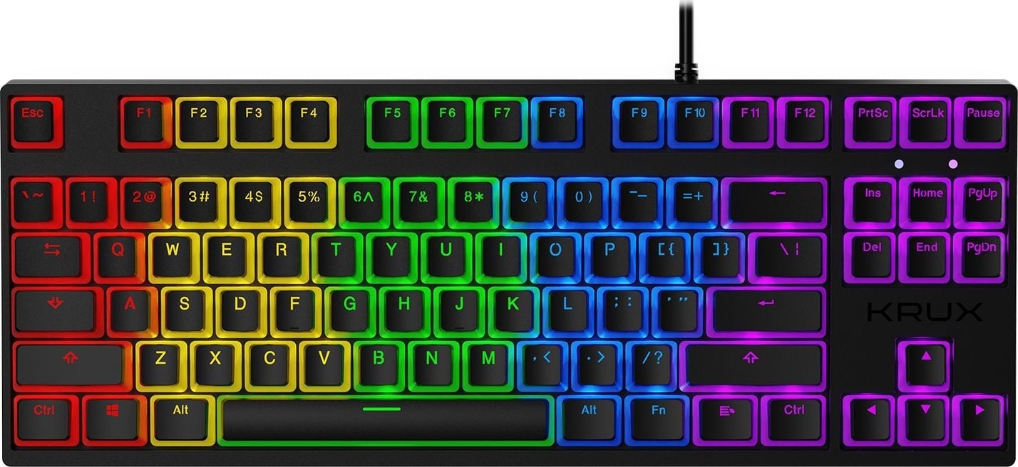 Krux Atax PRO RGB Pudding Outemu Black to klawiatura mechaniczna przyozdobiona półprzezroczystymi nakładkami na klawisze bez bloku numerycznego, w żargonie gamerskim nazywana TKL. Sprzęt idealny dla mobilnych graczy, którzy preferują kompaktowe wymiary i mobilność sprzętu ponad wszystko.