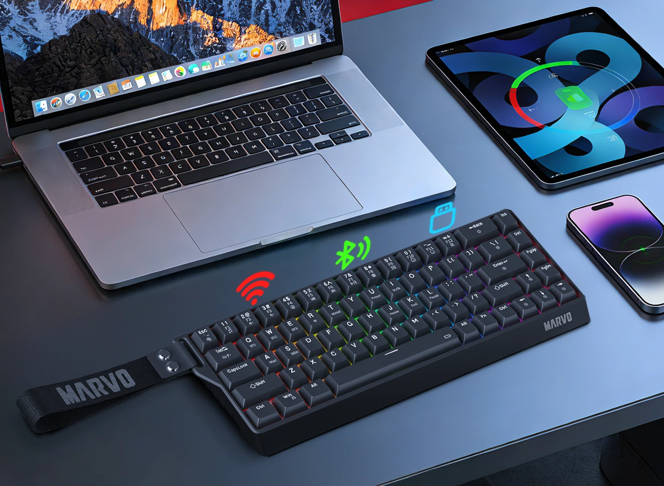 Saber 65W obsługuje trzy tryby połączenia - bezprzewodowy 2.4G, Bluetooth 5.3 i przewodowy USB - dając Ci pełną swobodę przełączania się między urządzeniami i platformami. Niezależnie od tego, czy grasz na komputerze, pracujesz na laptopie, czy łączysz się z wieloma urządzeniami, płynna łączność jest zawsze na wyciągnięcie ręki.