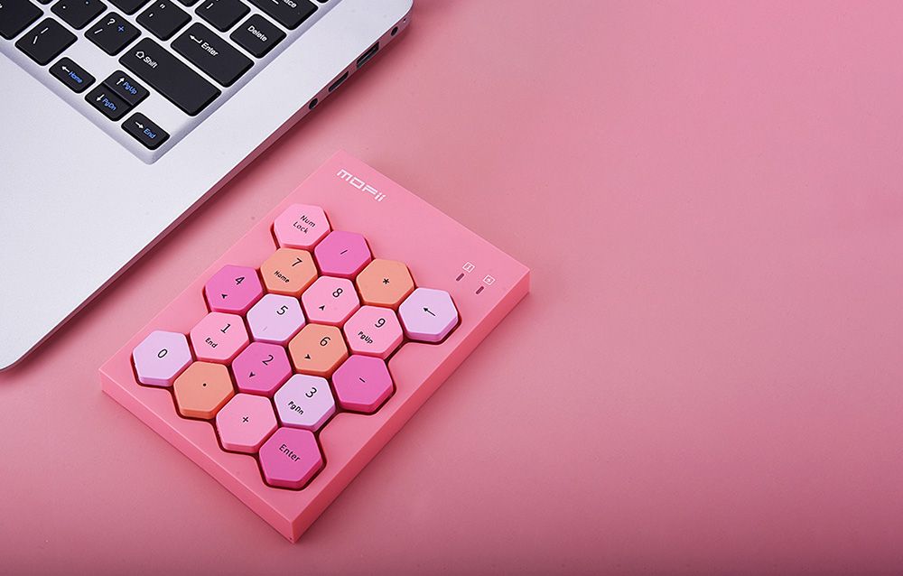 Szukasz poręcznej klawiatury numerycznej, która wyróżnia się bezprzewodową pracą i nowoczesnym designem? MOFII SK-660AG spełni Twoje oczekiwania. Została wyposażona w 18 klawiszy, a jej wymiary to jedynie 87 x 124 x 18 mm. Klawiatura pracuje w paśmie 2.4G i zapewnia stabilne połączenie o zasięgu nawet 10 m — sprawdzi się w księgowości czy podczas wykonywania dużych obliczeń matematycznych.