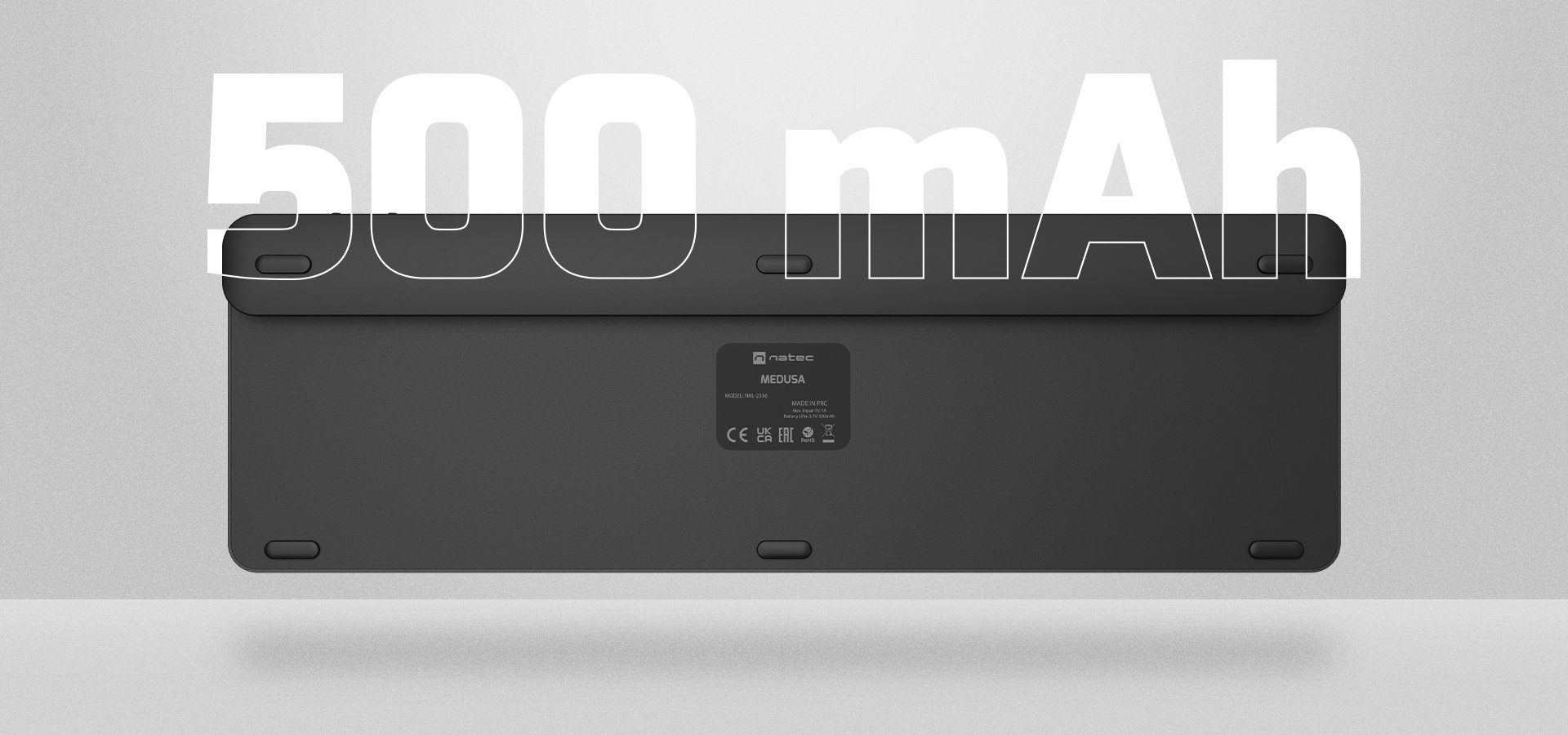 Dzięki baterii o pojemności 500 mAh nie musisz martwić się o ciągłą wymianę baterii. Wystarczy, że naładujesz swoją klawiaturę aby cieszyć się jej pracą nawet przez miesiąc. Oszczędzasz czas i pieniądze, wybierając rozwiązanie nowoczesne.