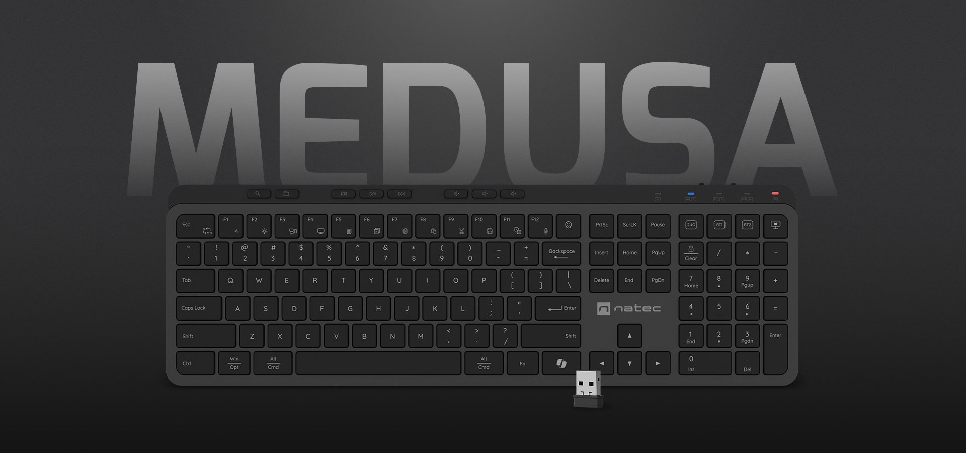 Natec Medusa to klawiatura stworzona z myślą o użytkownikach, którzy oczekują więcej niż tylko podstawowej funkcjonalności. Jej elegancki wygląd, wielozadaniowość i bezprzewodowa łączność oraz swoboda parowania urządzeń sprawiają, że doskonale sprawdzi się zarówno w biurze, jak i w domowym zaciszu.