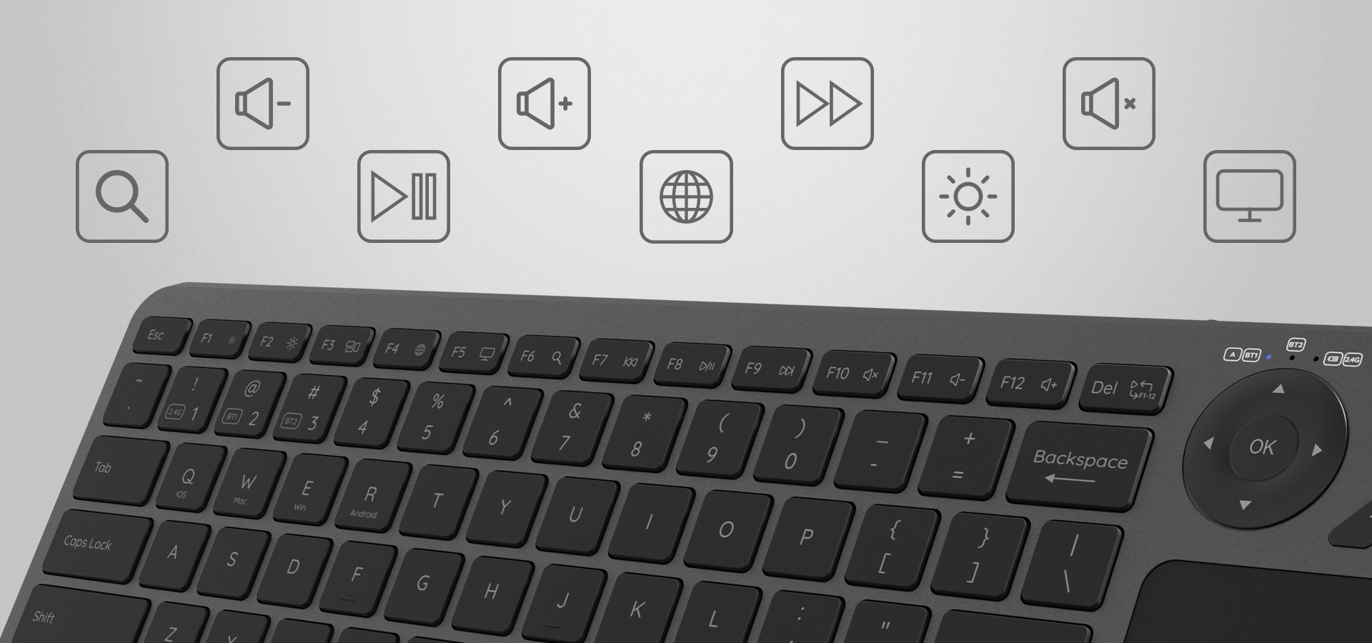 Aż 22 dedykowane klawisze multimedialne i funkcyjne dają Ci natychmiastowy dostęp do najważniejszych opcji Smart TV i ulubionych aplikacji. Przyciski umieszczone nad touchpadem umożliwiają wygodne sterowanie kciukiem – regulację głośności, pauzę czy nawigację w serwisach do streamingu treści. To rozwiązanie realnie przyspiesza obsługę i wyróżnia klawiaturę wśród podobnych produktów dostępnych na rynku.