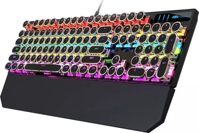MageGee MK-STORM to mechaniczna klawiatura, która przyciąga uwagę unikalnym designem retro z okrągłymi klawiszami inspirowanymi starą maszyną do pisania. Jej czarna kolorystyka nadaje elegancji, a doskonała funkcjonalność sprawia, że jest to niezastąpione narzędzie dla graczy i osób szukających stylowego sprzętu do codziennej pracy.