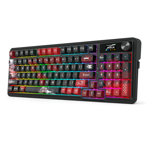 Redragon K719GF-RGB-PRO to klawiatura mechaniczna w układzie 96%, która łączy funkcjonalność pełnowymiarowego modelu z bardziej kompaktową formą. Dzięki 95 klawiszom zachowuje pełny blok numeryczny i wszystkie najważniejsze przyciski, jednocześnie zajmując mniej miejsca na biurku. Artystyczne nadruki na keycapach PBT (Polybutylene Terephthalate) nadają jej wyrazisty charakter w stylu anime, dzięki czemu wyróżnia się na tle innych klawiatur. Solidna konstrukcja o wadze 830 g, w połączeniu z gasket mount i zaawansowanym systemem wyciszenia, zapewnia stabilność oraz przyjemną, miękką akustykę każdego kliknięcia.