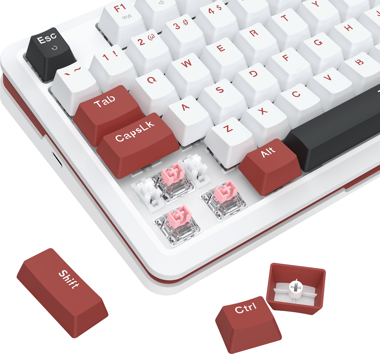 Kompaktowy układ 75% w białej-czerwonej kolorystyce zapewnia unikalny wygląd, który wyróżni Twoje stanowisko. Klawiatura jest w pełni kompatybilna z Windows oraz macOS, co czyni ją wszechstronnym wyborem nie tylko do gry, ale również do pracy. Dodatkowo multimedialne pokrętło, które nie tylko umożliwia regulację głośności, ale także szybką zmianę podświetlenia RGB daje możliwość kontrolowania swojego środowiska gry oraz pracy z pełną wygodą!