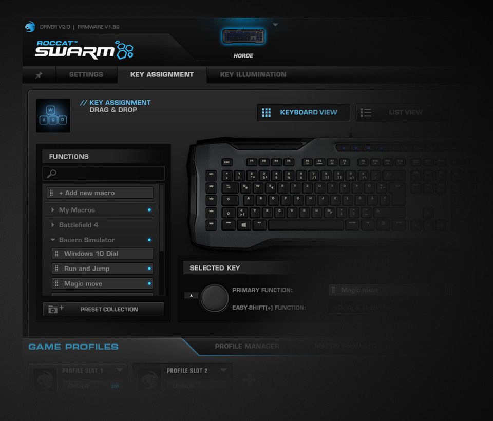 Oprogramowanie Swarm stanowi ucieleśnienie filozofii ROCCAT®, w myśl której staramy się być o jeden krok naprzód. Jest to system najnowszej generacji, który obejmuje wszelkie liczące się platformy i urządzenia do grania, a także stanowi jednolity ośrodek gier, aplikacji i produktów ROCCAT®, zapewniając zaawansowaną integrację produktów i uniwersalny węzeł ze sterownikami do wszystkich urządzeń ROCCAT®. Pożegnaj dziesiątki ikon na pasku zadań – dzięki Swarm otrzymasz skuteczne centrum dowodzenia, z którego możesz zarządzać każdą bronią w Twoim arsenale.