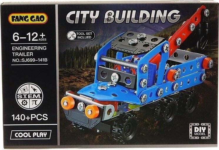 Zestaw 140 metalowych klocków do konstruowania, z narzędziami.