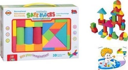 Zestaw klocków piankowych składa się z 58 elementów o różnorodnych kształtach i kolorach. Dzięki temu dzieci mogą tworzyć nieograniczone konstrukcje, co łączy zabawę z nauką i rozwija ich wyobraźnię.