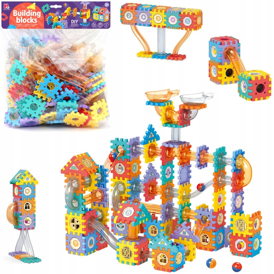 Zabawa klockami wspiera rozwój myślenia przestrzennego, logicznego, kreatywności oraz umiejętności manualnych. Dzieci uczą się zasad fizyki poprzez obserwację ruchu kulek, co dodatkowo rozwija ich zdolności do rozwiązywania problemów.