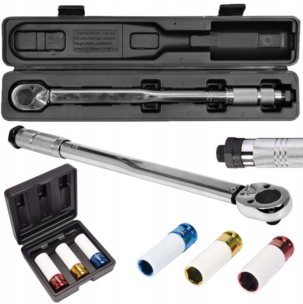 W zestawie znajdują się trzy chromowane nasadki w rozmiarach 17 mm, 19 mm i 21 mm, dostępne w różnych kolorach. Dzięki temu ich rozróżnienie staje się proste i wygodne, co przyspiesza pracę w warsztacie.