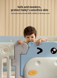 | Duży, praktyczny, składany kojec modułowy dla dziecka od-6 go miesiąca życia. Z kojca możemy ułożyć dowolną konstrukcję, według własnych upodobań, bardzo łatwo się składa i rozkłada, jest stabilny i posiada gładkie krawędzie. Wnętrze kojca wyposażono w manipulacyjne elementy takie jak przesuwane kółeczko, zębatki, piszczałkę czy kierownicę. Zestaw wykonano z trwałych i nietoksycznych materiałów, składa się z 10 paneli. Panel drzwi blokuje się, na zewnątrz uniemożliwiając otwarcie drzwi przez dziecko. Antypoślizgowe nóżki zapobiegają przesuwaniu się kojca. W kojcu twój maluszek będzie mieć wystarczającą ilość miejsca do swobodnego przemieszczania się, a jednocześnie będzie bezpieczny. W zestawie znajduje się również kosz na piłeczki i 40 piłeczek.