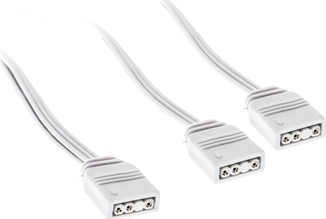 Kabel jest wyposażony w standardowe 3-pinowe złącza adresowalne RGB, które dzielą jedno złącze żeńskie na dwa złącza żeńskie. W zestawie znajdują się również dwa adaptery męskie, co znacznie ułatwia podłączenie i instalację.