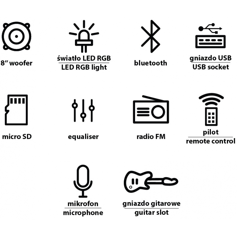 | Złącza: | jack 6,3 mm (gitara + 2 x mikrofon), AUX IN, USB, SD |