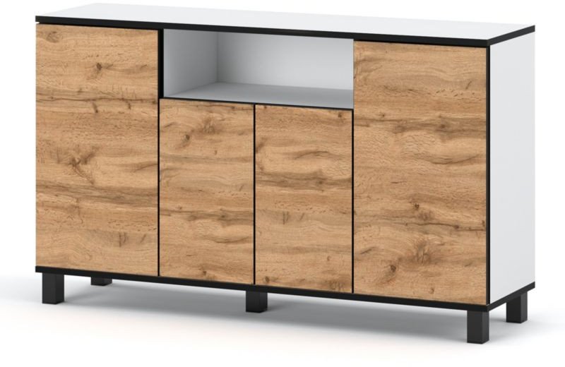 Komoda BRUNO wyposażona jest w cztery zamykane drzwiczki, które skrywają przestronne półki, idealne do przechowywania różnorodnych przedmiotów. Dodatkowo, otwarta półka stanowi doskonałe miejsce na dekoracje lub książki, co czyni ją funkcjonalnym meblem do salonu, sypialni czy pokoju młodzieżowego.