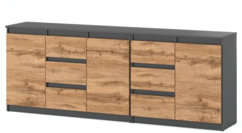 Komoda Best Agnes to stylowy mebel, który harmonijnie łączy nowoczesny design z praktycznością. Jej wymiary to 200 cm szerokości, 35 cm głębokości oraz 75 cm wysokości, co czyni ją idealnym wyborem do sypialni, salonu czy przedpokoju. Wykonana z wysokiej jakości płyty laminowanej w matowym szarym kolorze z frontem w odcieniu Dębu Wotan, komoda doskonale wkomponuje się w różnorodne aranżacje wnętrz.