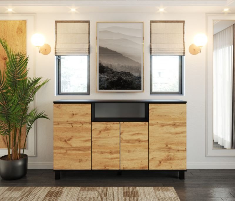 Komoda BRUNO wyróżnia się nowoczesnym wykończeniem w matowej czerni oraz dębie, co sprawia, że jest nie tylko praktyczna, ale również stylowa. Jej minimalistyczny wygląd doskonale harmonizuje z innymi elementami wyposażenia, dodając elegancji każdemu pomieszczeniu.